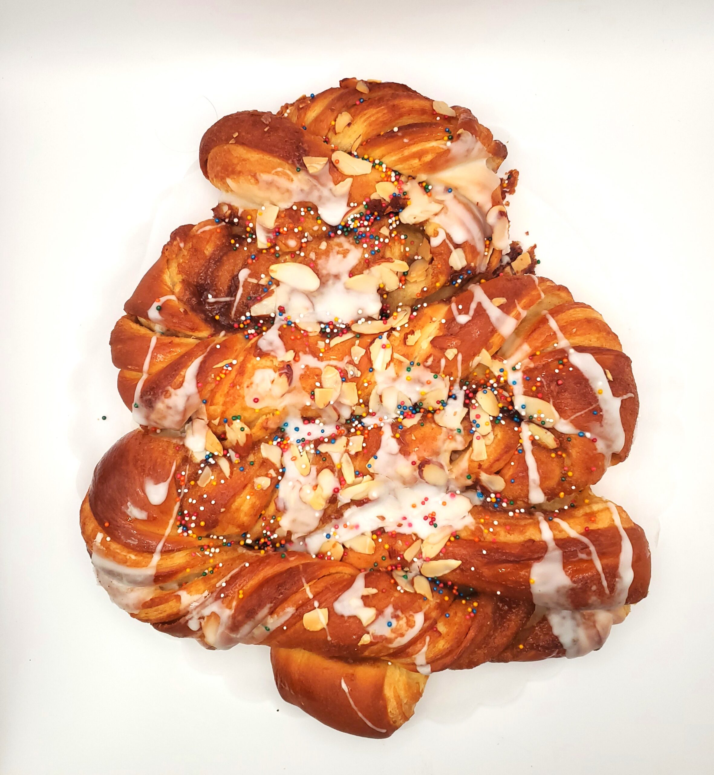 Sweet dough with cinnamon decorated with royal icing and sprinkles.